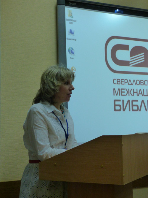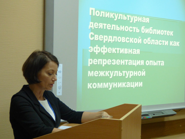 Кокорина Светлана Васильевна, кандидат педагогических наук, главный библиотекарь сектора толерантности и культурных программ отдела обслуживания СОМБ представила анализ деятельности муниципальных библиотек Свердловской области по работе с поликультурным населением в своем докладе «Поликультурная деятельность библиотек Свердловской области как эффективная репрезентация опыта межкультурной коммуникации».