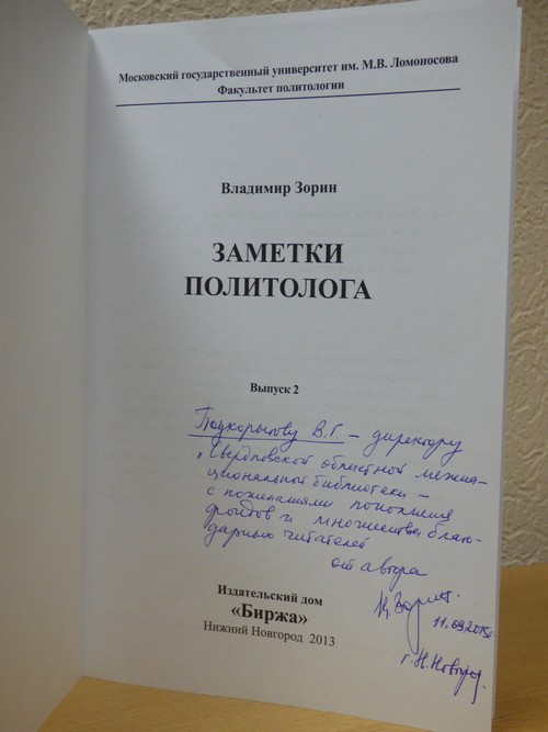 Впечатленный выступлением директора библиотеки и деятельностью самой библиотеки Владимир Юрьевич Зорин (первый заместитель Председателя Совета Ассамблеи народов России, заместитель директора Института этнологии и антропологии РАН, член Совета при Президенте РФ по межнациональным отношениям, доктор политических наук) вручил памятный подарок - книгу «Заметки политолога» с теплыми пожеланиями.