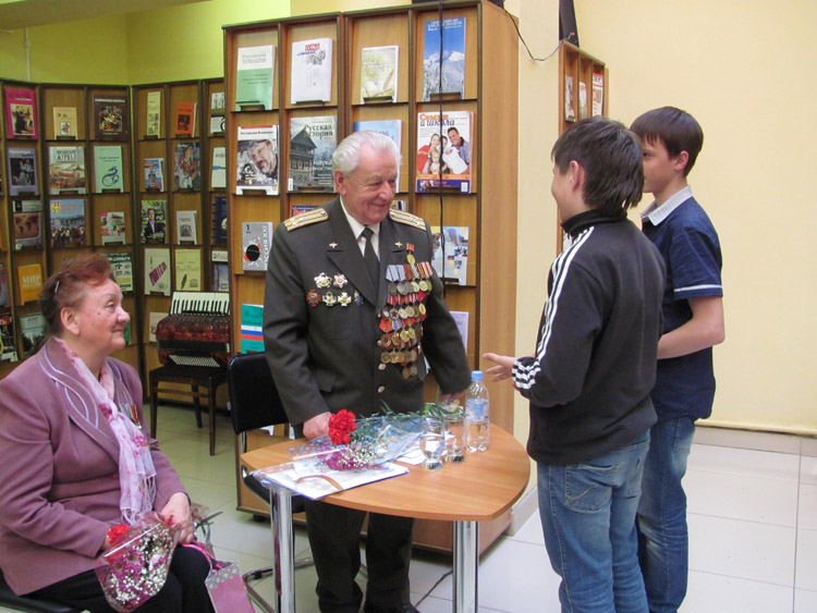 Директор библиотеки Виктор Георгиевич Подкорытов поблагодарил ветеранов, поздравил всех присутствующих с Днем Победы и отметил значимость для подрастающего поколения таких встреч с людьми, пережившими войну и ценой своей жизни обеспечившими нам будущее.