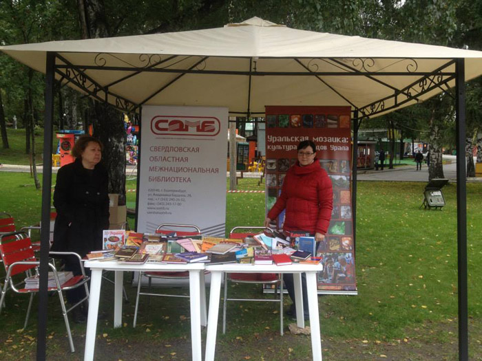 Свердловская областная межнациональная библиотека также приняла участие в праздновании, представив гостям праздника выездную книжную экспозицию «Уральская мозаика: культура народов Урала», в которую вошли книги об истории, этнографии, традиционной культуре, национальной кухне, языках и фольклоре народов, проживающих на территории Среднего Урала. Особый интерес вызвали у посетителей словари и разговорники, позволяющие изучить основы эрзянского, узбекского языка, иврита и т.д., а также книги по национальной вышивке и кухне. Гостям «библиотечного шатра» подарили настольные этнокалендари и уникальные экземпляры «Литературного альманаха народов Урала».