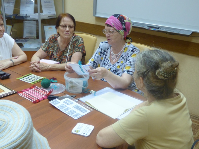 Гусева Алевтина Петровна рассказала и показала, как выполняется счетная вышивка «набор». Это вышивка двусторонней счетной гладью, представляет собой орнаментальную полосу. Даже опытные рукодельницы с удовольствием обучались новой, для них, технике вышивки.