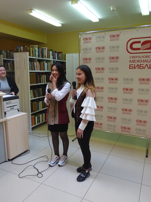 Конечно же, Межнациональная библиотека не могла не сделать акцент на культурах народов Урала. Продолжили праздничный концерт ученицы МАОУ СОШ № 85 Диана Киштарбек и Сезимай Жаныбекова, исполнив песню на киргизском языке.