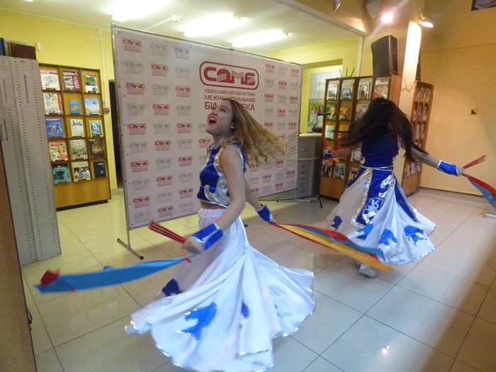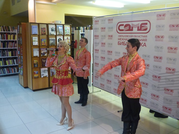 Весь вечер гостей радовала музыкальными выступлениями лауреат всероссийских и международных конкурсов, обладательница премии им. Валентины Толкуновой, руководитель собственного Театра песни, солистка ансамбля песни и пляски Уральского округа войск национальной гвардии Российской Федерации – Наталья Плешнёва и ее шоу-балет. Также поздравили библиотеку студенты Уральского федерального университета из Китая и талантливые исполнители от национально-культурных объединений: соло на восточных барабанах исполнил Джасур Базаров (Свердловская региональная общественная организация «Общество дружбы Урал-Узбекистан»); Бримжанова Раушан на казахском языке спела песню «Арманым» («Мечта») (Свердловская региональная общественная организация «Евразия-Казахстан»); сернурский танец танец в исполнении ансамбля Яндар Памаш (Екатеринбургская городская общественная организация марийцев «Урал Кундем»).