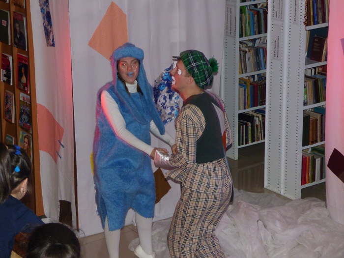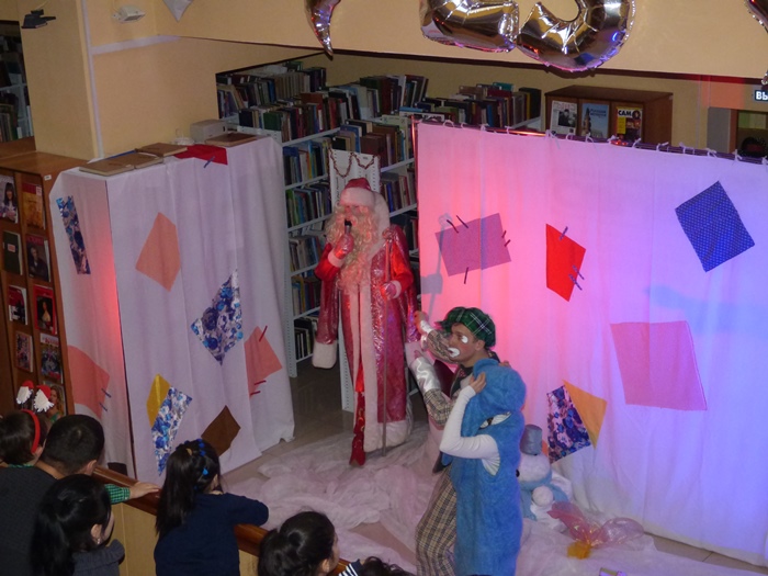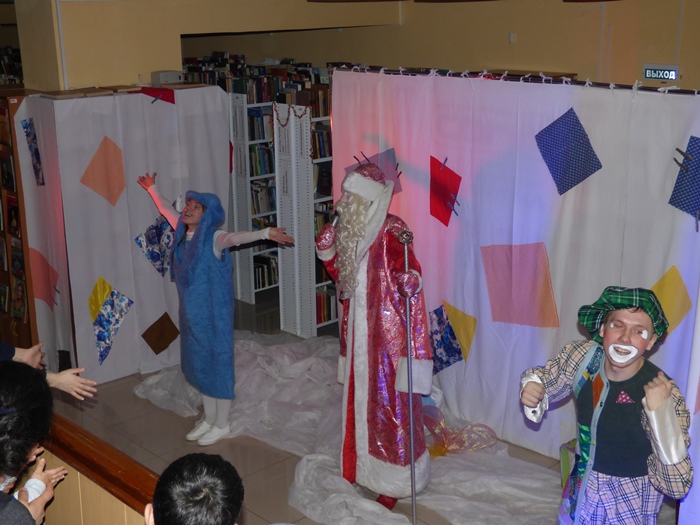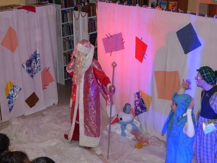 Ну а после того как все зарядились волшебством и отведали сладостей, детей ждал новогодний спектакль! Герои спектакля – Муфта, Полботинка и Моховая Борода – «дружились» со своими зрителями через национальные танцы, играли с ними в «снежки» и знакомили с главными персонажами новогодних праздников у разных народов: Кыш Бабай у татар, Тол Бабай у удмуртов, Корбобо у узбеков и др. Ну и, конечно же, поздравить детей пришел русский Дед Мороз!