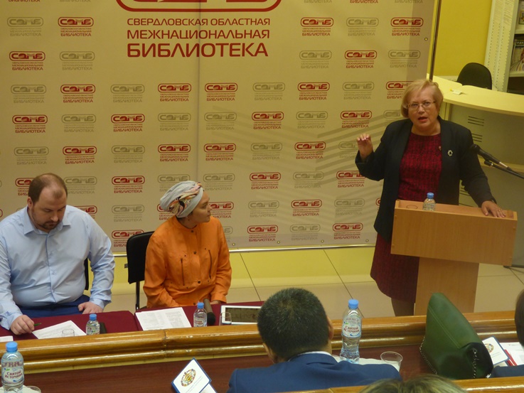 Уполномоченный по правам человека в Свердловской области Татьяна Георгиевна Мерзлякова отметила актуальность встречи, рассказала о необходимости модерацииобщественных дискуссий по острым проблемам, которая способна нивелировать противостояние между местными и приезжими, вывести его из зоны конфликта в зону поиска компромисса. Выступающая следом заместитель начальника информационно-аналитического департамента администрации города Екатеринбурга Ольга Ивановна Котлярова также отметила, что теме профилактики экстремизма уделяется большое внимание, в том числе, внимание к работе гражданского обществ по этой тематике подкрепляется субсидиями, выделяемыми Администрацией города Екатеринбурга для поддержки деятельность некоммерческих организаций.