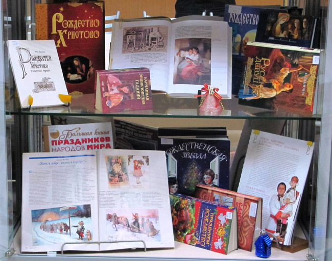 Празднование Рождества, святочные гадания с подблюдными песнями, колядки на русском и мордовском языках, рождественские угощения - все это можно найти на книжных полках выставки.