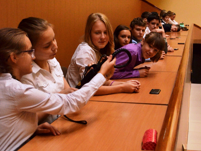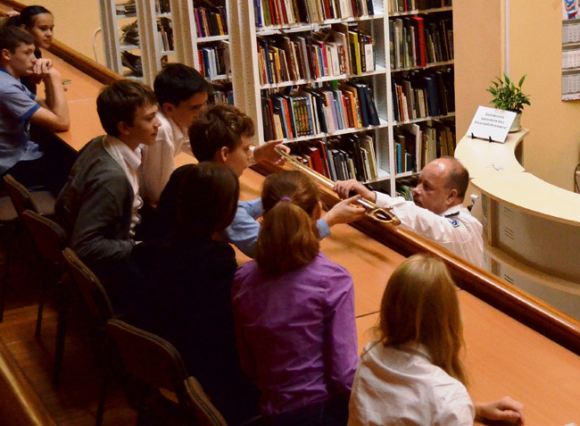 Писатель не только рассказал школьникам о новой книге, но и познакомил их с историей, военной формой и атрибутикой уральских казаков. Дмитрий Юрьевич является президентом фонда «Наследие Урала», направленного на возвращение уральской культуры и традиций, а также состоит в чине подхорунжего Оренбургского казачьего войска (исетской линии). Он рассказал ребятам о екатеринбургском казачьем кадетском классе и продемонстрировал главные атрибуты казака – шашку и нагайку.