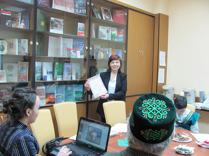 21 февраля в Свердловской областной межнациональной библиотеке состоялась встреча представителей регионального общественного объединения «Свердловский областной Башкирский Центр», приуроченная к Международному дню родного языка. Президент Свердловского областного Башкирского центра Фаима Фахритдиновна Юсупова рассказала школьникам и студентам башкирам о зарождении и развитии башкирского языка, обратила внимание на то, что язык – душа народа. С помощью языка любой народ из поколения в поколение передает свое мировоззрение, свое воспитание окружающей деятельности, ценностные ориентиры. В свою очередь, молодежь обсудила перспективы и методы изучения башкирского языка в России. Так же гости представили национальные костюмы, пели песни на башкирском языке и продемонстрировали презентацию о Республике Башкортостан.