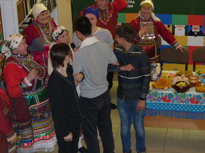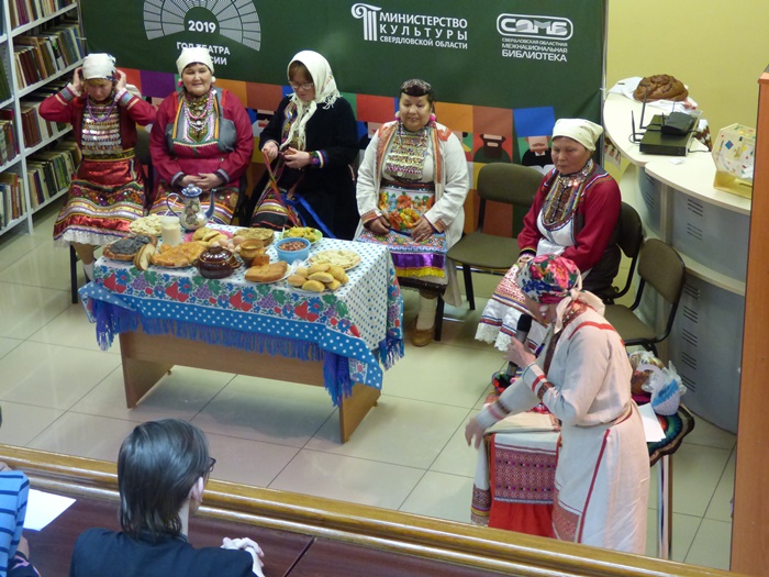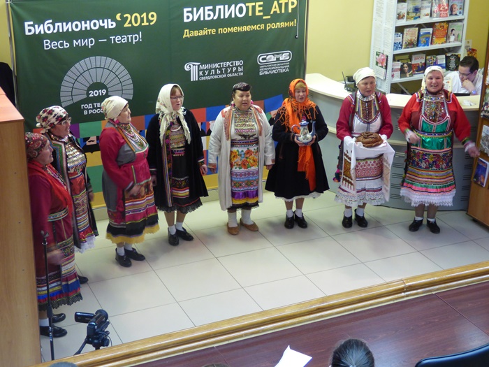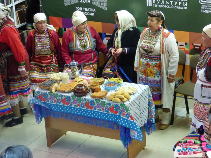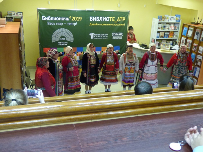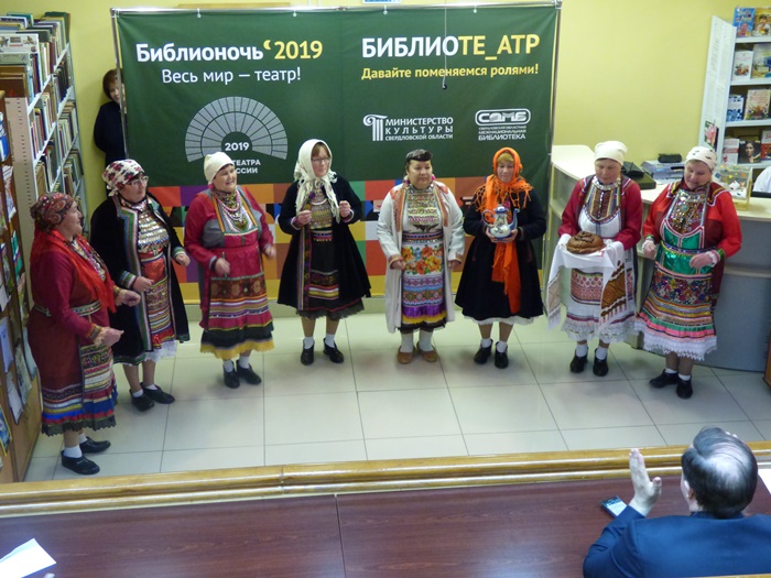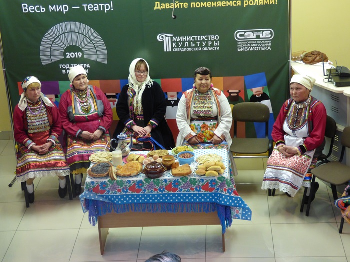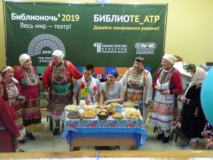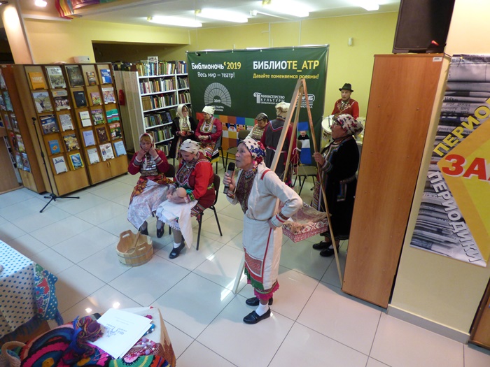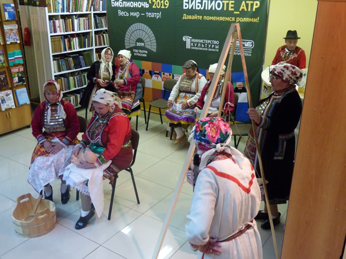 Истоки театра в обрядах и играх! Незабываемое впечатление на всех участников Библионочи в Межнациональной библиотеке произвел Народный коллектив песни и танца марийской культуры «Муро Памаш» («Песенный родник»), филиала Куркинского муниципального бюджетного учреждения «Центр культуры, досуга и народного творчества Артинского городского округа». Жители с. Курки на протяжении многих лет чтут память предков, сохраняют народные обычаи, обряды, молитвы народа мари, национальные костюмы, песни и танцы. Знакомство с коллективом началось с дефиле в национальных костюмах, а после этого они представили инсценировку двух очень важных событий из жизни марийцев.