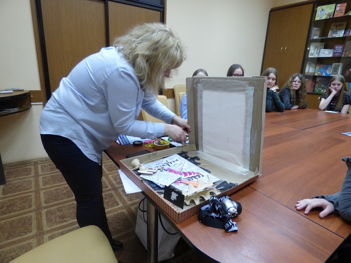 Началась она с Библиосумерек вместе с Евгенией Перловой – поэтом, писателем, переводчиком, дипломантом всероссийских и международных литературных конкурсов, лауреатом Международного литературного конкурса малой прозы «ЭтноПеро» (2018 г.). Евгения Перлова подготовила для участников творческий мастер-класс – дети сыграли в театр теней, сочиняя собственную историю.