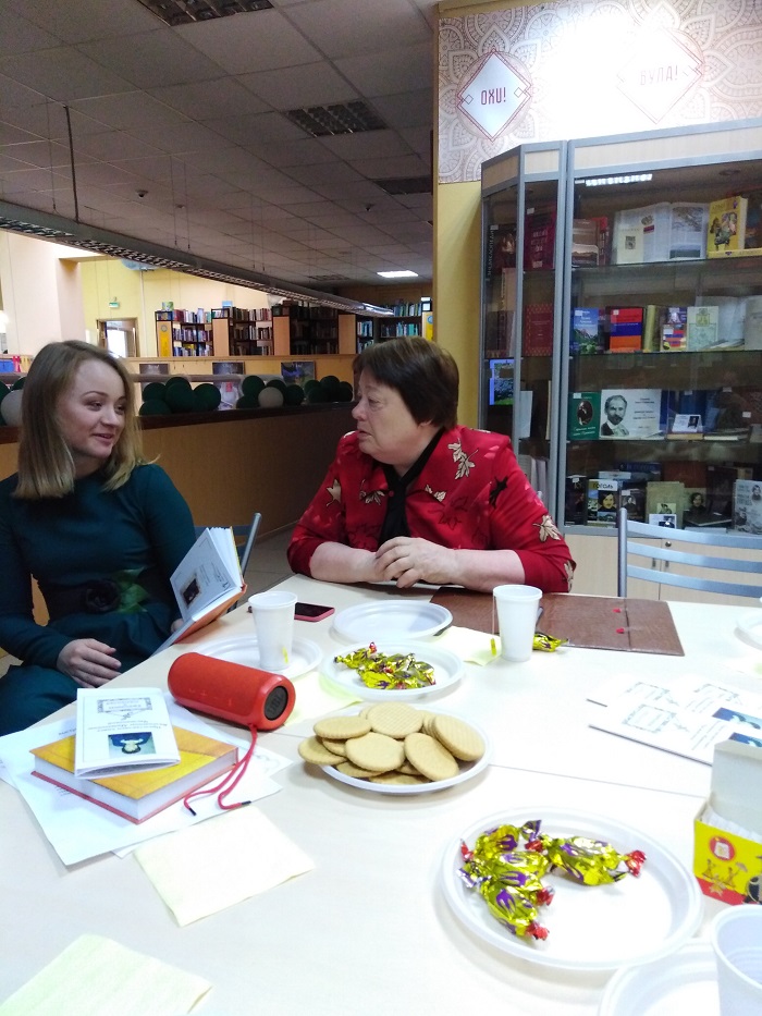 В конце встречи ждала интрига, за круглым столом с чаем и конфетами была сама автор книги «Соринки в неглиже» Валентина Матвеевна Чистякова. Она ответила на вопросы участников встречи.