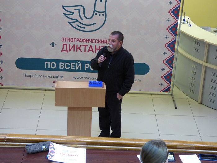 Приглашенным гостем Большого этнографического диктанта на площадке Межнациональной библиотеки стал Арсен Борисович Титов, сопредседатель Союза российских писателей, председатель правления Екатеринбургского отделения Союза российских писателей, лауреат Международной премии «Ясная Поляна», Международного кинофестиваля «Золотой Витязь», дважды лауреат Премии губернатора Свердловской области и других литературных премий. Арсен Борисович не только поприветствовал всех участников акции, но и прочел небольшой отрывок из своей книги «Старогрузинские новеллы», которая вышла в 2019 году.