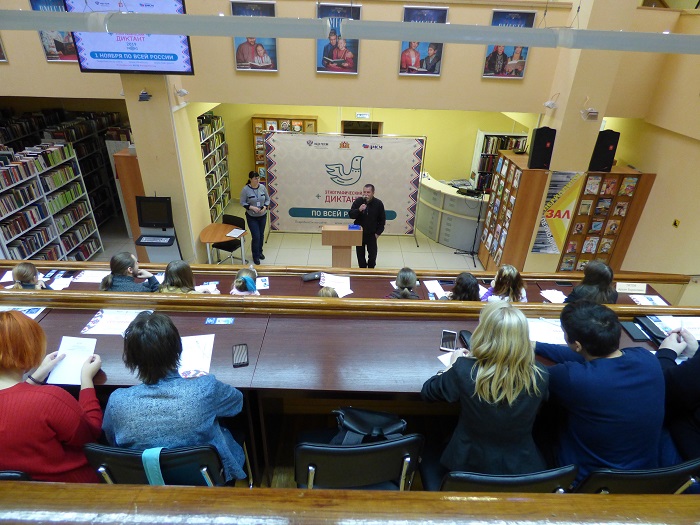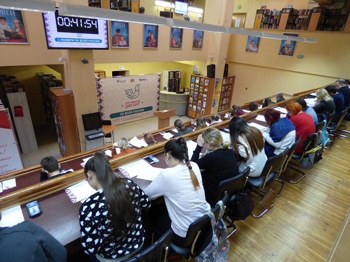 Для участников Диктанта в библиотеке была организованы презентация книжной экспозиции «Язык. Традиции. Культура», приуроченная к Международному году языков коренных народов, и специальный показ социальной рекламы, формирующей уважительное отношение к представителям различных национальностей, проживающих в Свердловской области, выпущенной Межнациональной библиотекой.