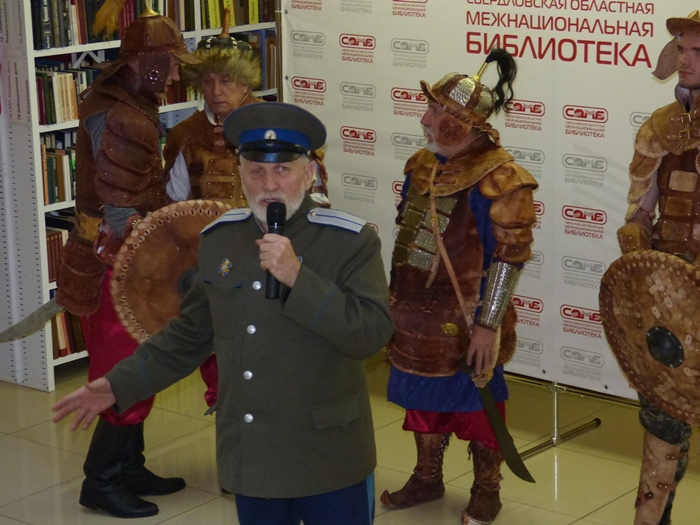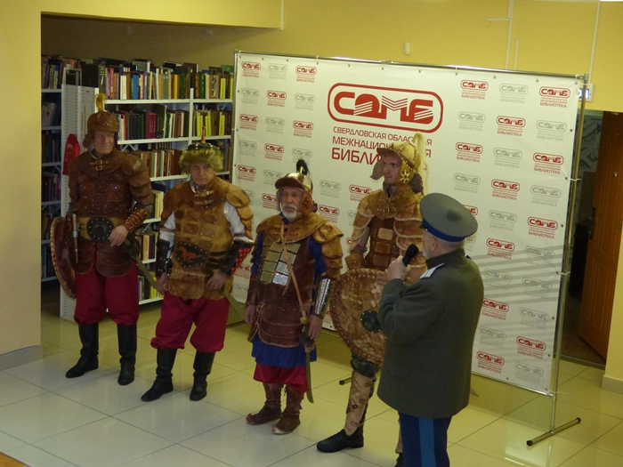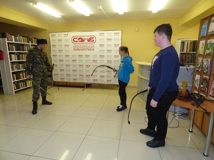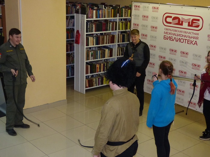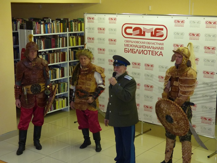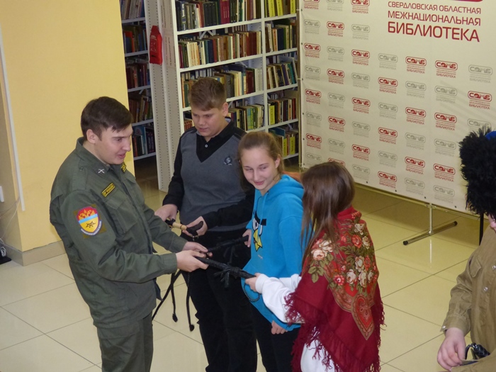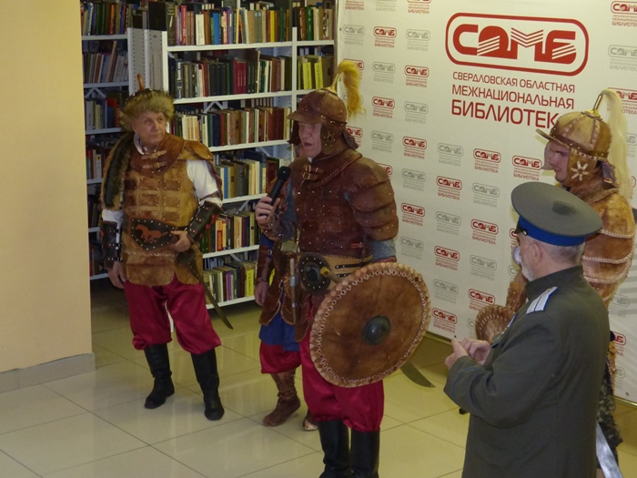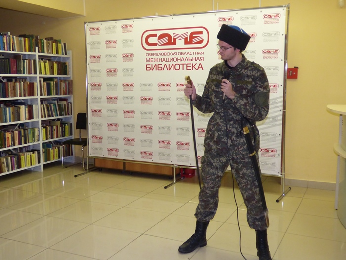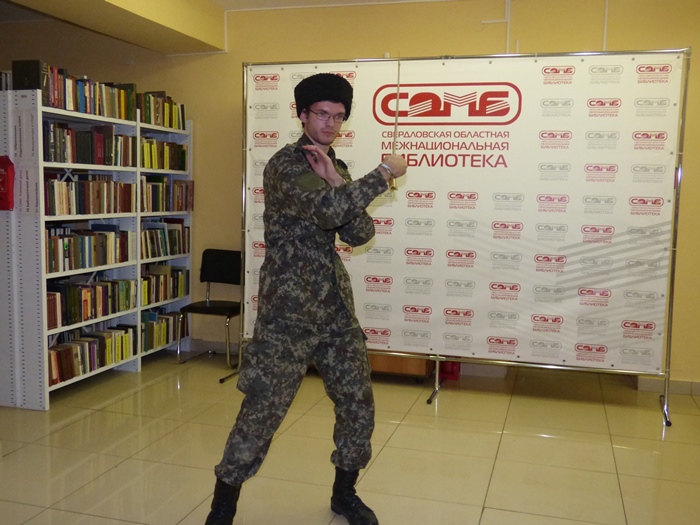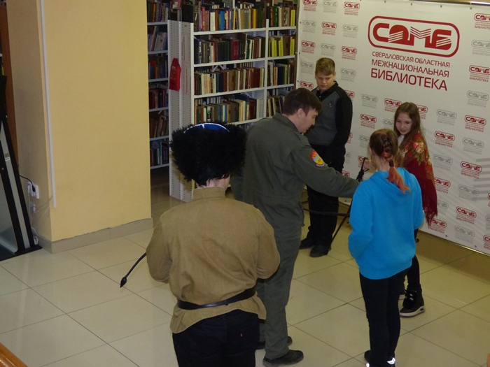 12 декабря в Свердловской областной межнациональной библиотеке казаки провели культурно-исторический квест "Путь Ермака" для школьников. Все участники мероприятия стали свидетелями исторической реконструкции, воссоздавшей времена покорения Сибири Ермаком. Анатолий Владимирович Потанин, старейшина станицы "Сухоложская", увлекательно рассказал о Сибирском походе Ермака в 1581—1585 годах, а руководитель военно-исторического клуба "Феникс" Владимир Матлашевский продемонстрировал мастерство фланкировки. Участники смогли сфотографироваться с казачьей амуницией.