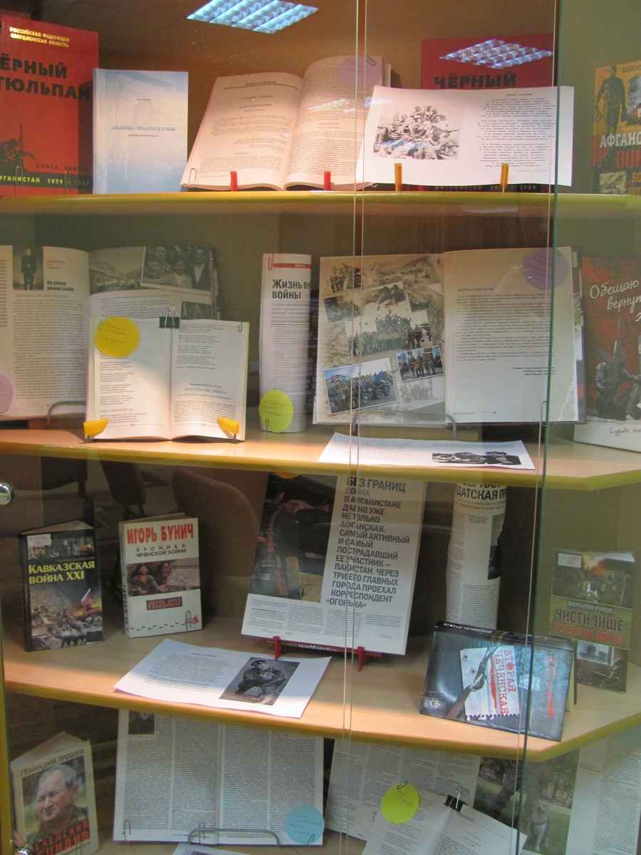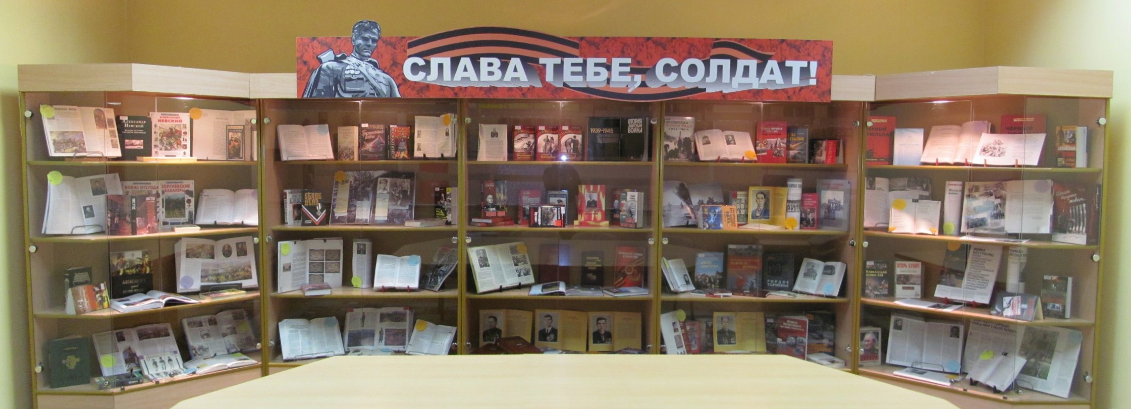 Книжная выставка «Слава тебе, солдат» посвящена героям, защищавшим нашу Родину и от ливонских рыцарей, и от полков Наполеона, и от фашистских захватчиков, а также воевавших в Чечне и Афганистане.