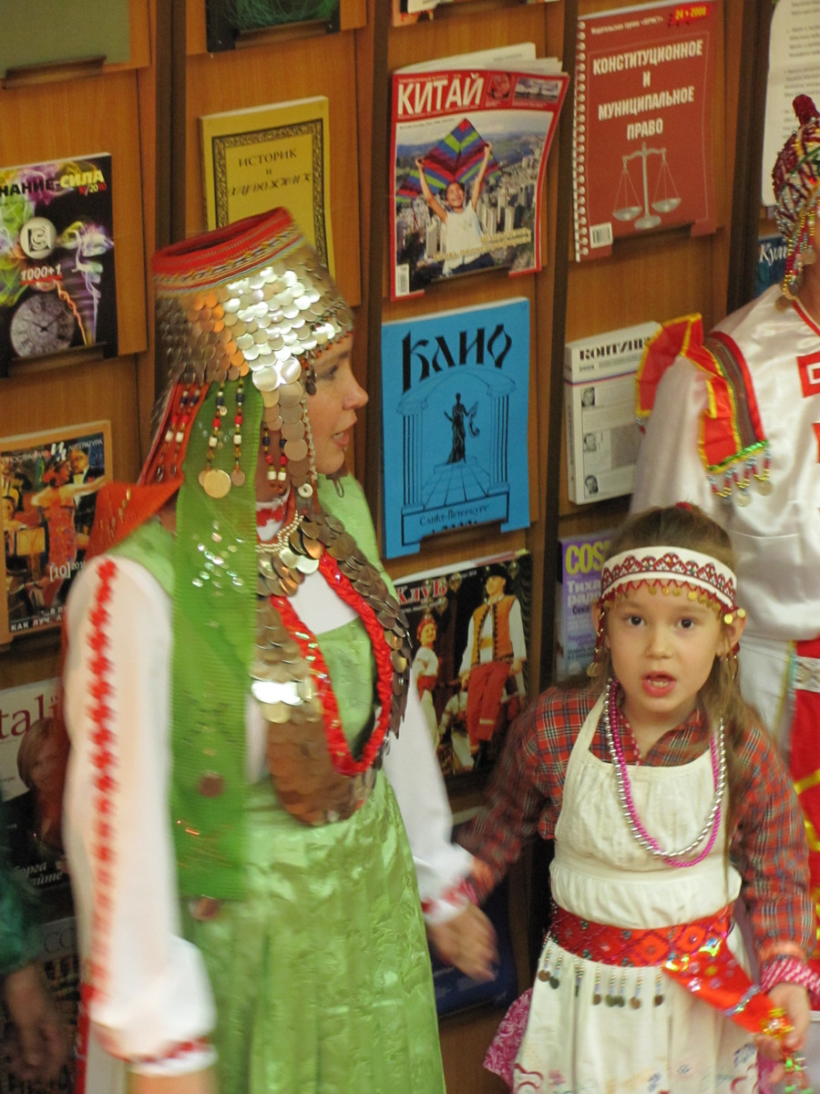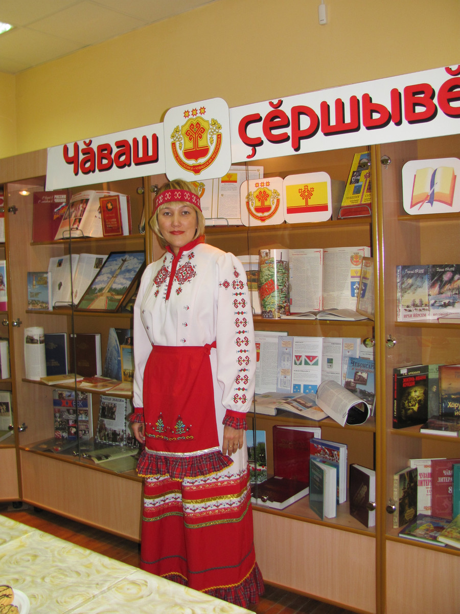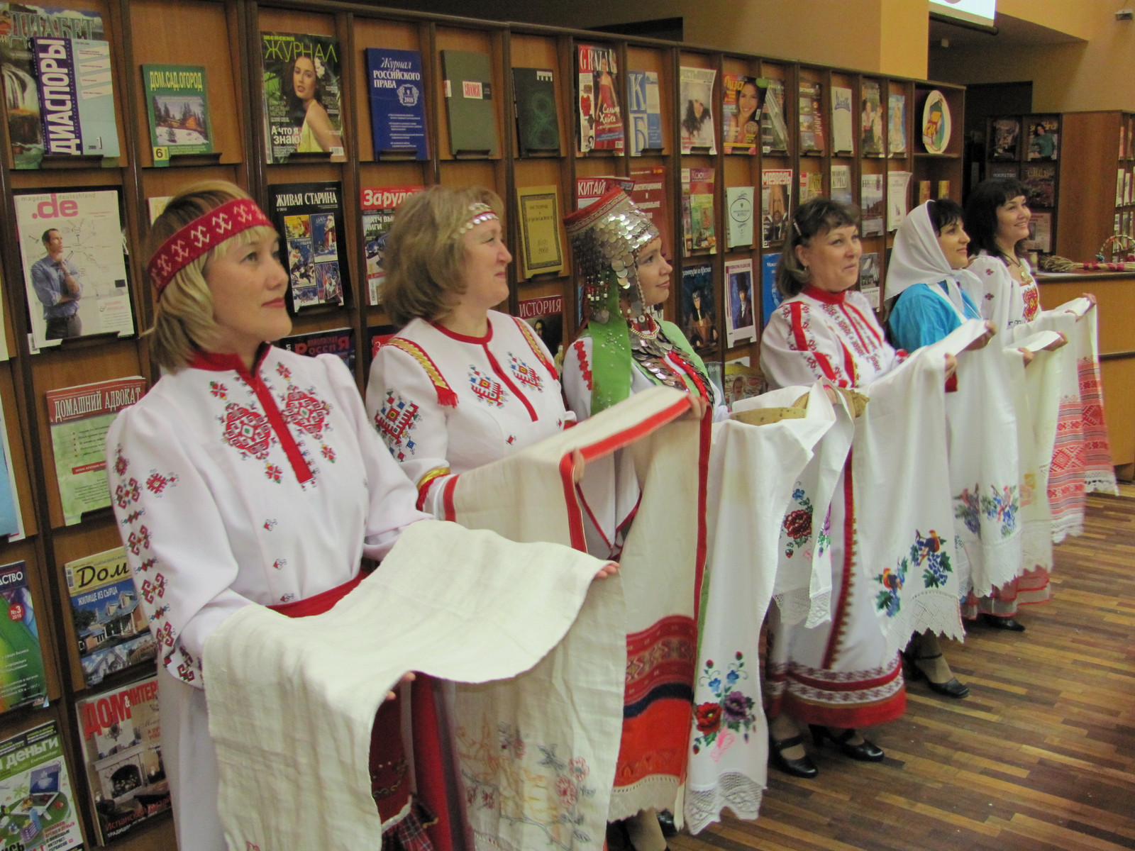 Раздел книжной выставки, в котором представлены книги об искусстве башкир, был замечательно проиллюстрирован красочными башкирскими нарядами, расшитыми бисером, мехом и монетами, а так же образцами башкирской народной вышивки и ткачества из коллекции Тюменцевой Нафисы Фасхетдиновны.
