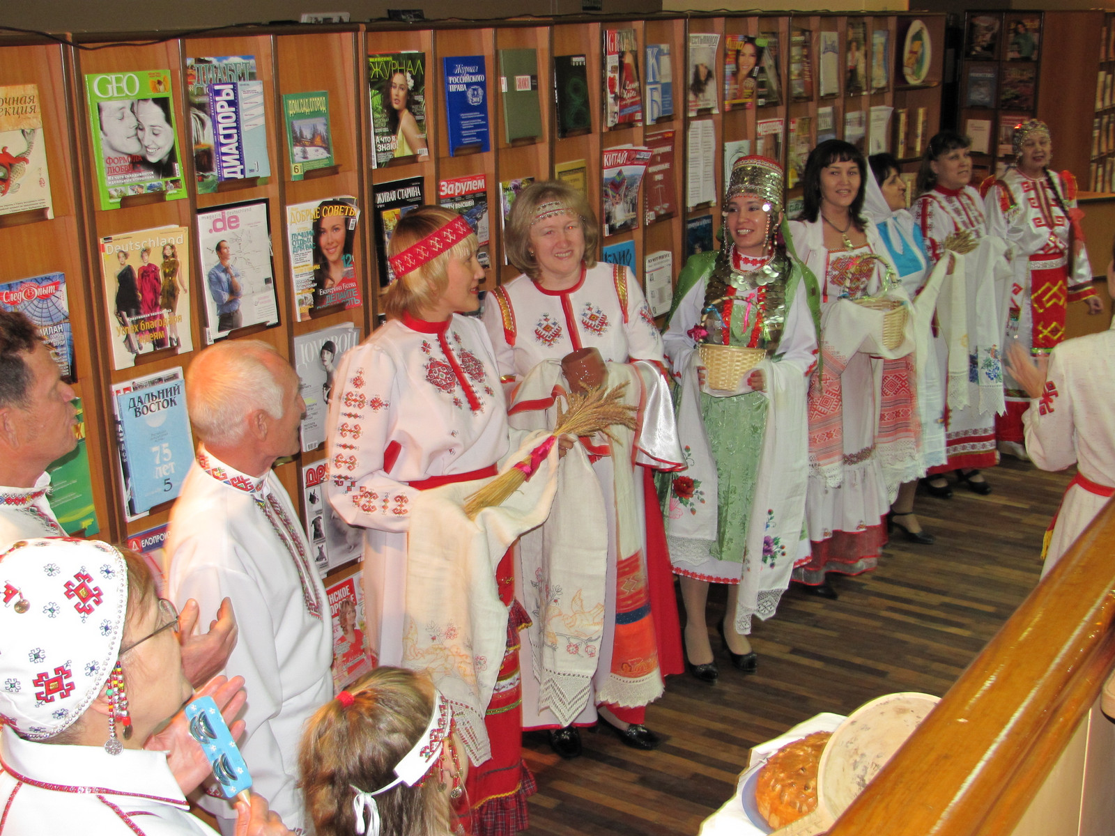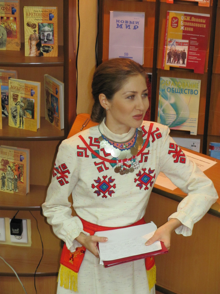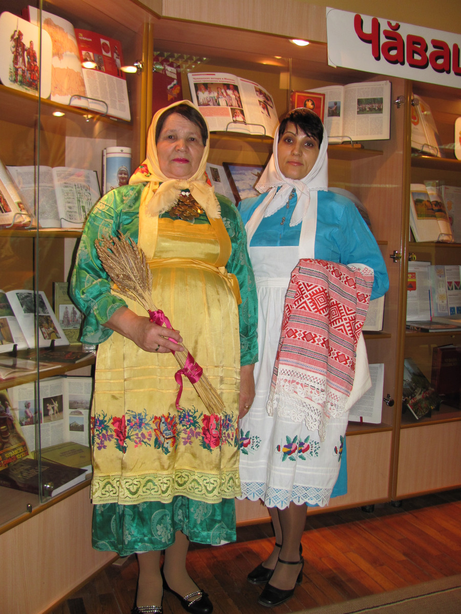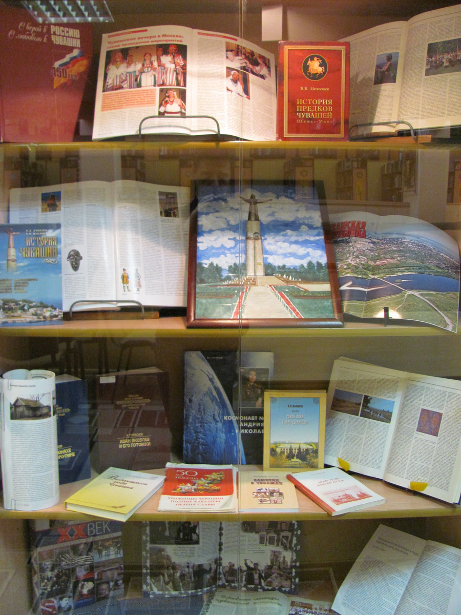 Раздел книжной выставки, в котором представлены книги об искусстве башкир, был замечательно проиллюстрирован красочными башкирскими нарядами, расшитыми бисером, мехом и монетами, а так же образцами башкирской народной вышивки и ткачества из коллекции Тюменцевой Нафисы Фасхетдиновны.