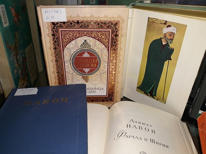 В 2021 году исполняется 580 лет со дня рождения Алишера Навои. И, конечно же, отдельный раздел выставки посвящен ему. Алишер Навои – гордость узбекского народа. На выставке представлена «Сокровищница мыслей» – издание избранных сочинений поэта на русском языке, в которое вошли газели, рубайяты, туюги и небольшая поэма «Месневи». Эту книгу в дар читателям Свердловской областной межнациональной библиотеки преподнес Союз писателей Узбекистана.